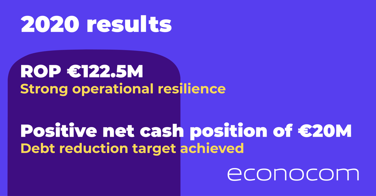 As previously announced, and despite its drop in revenue, Econocom posted €122.5m in Recurring Operating Profit2 (ROP) in 2020, slightly up on the previous year on a like-for-like basis. To achieve this level of performance, the group benefited from the effects of its cost-cutting plan launched in early 2019, the continuous productivity improvement in Services and its focus on projects with higher added value.